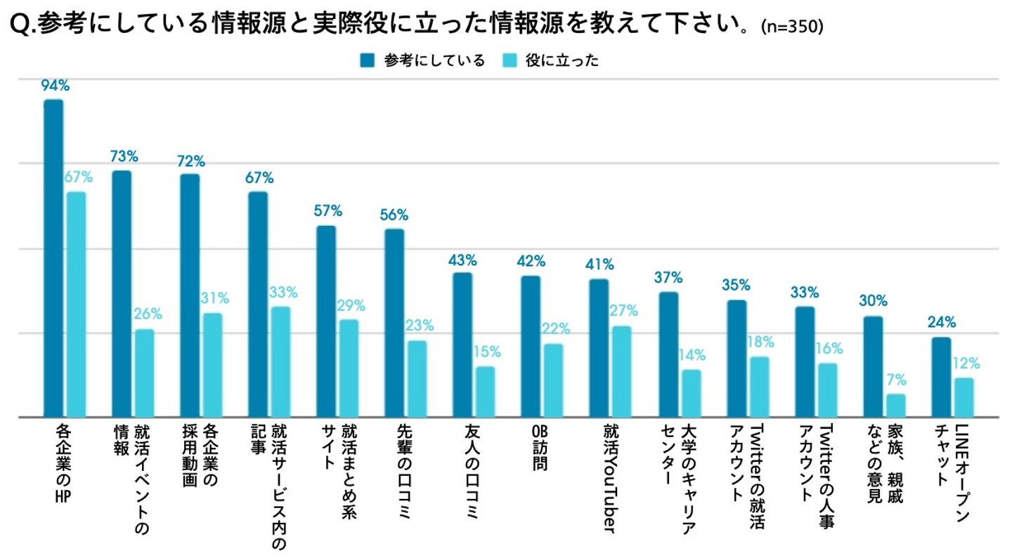 就活生が「とても参考にしている」と回答した情報源のトップは「各企業のHP(94%)」となり、次点で「就活イベントの情報(73%)」、「各企業の採用動画(72%)」が続いた。次に実際に役に立った情報源について聞いてみると、トップは「各企業のHP(67%)」で変わらなかったものの二番目以降に変化があり、参考にしている情報源では二番目だった「就活イベントの情報(26%)」が「就活サービス内の記事(33%)」や「各企業の採用動画(31%)」「就活Youtuber(27%)」を下回る結果となりました。