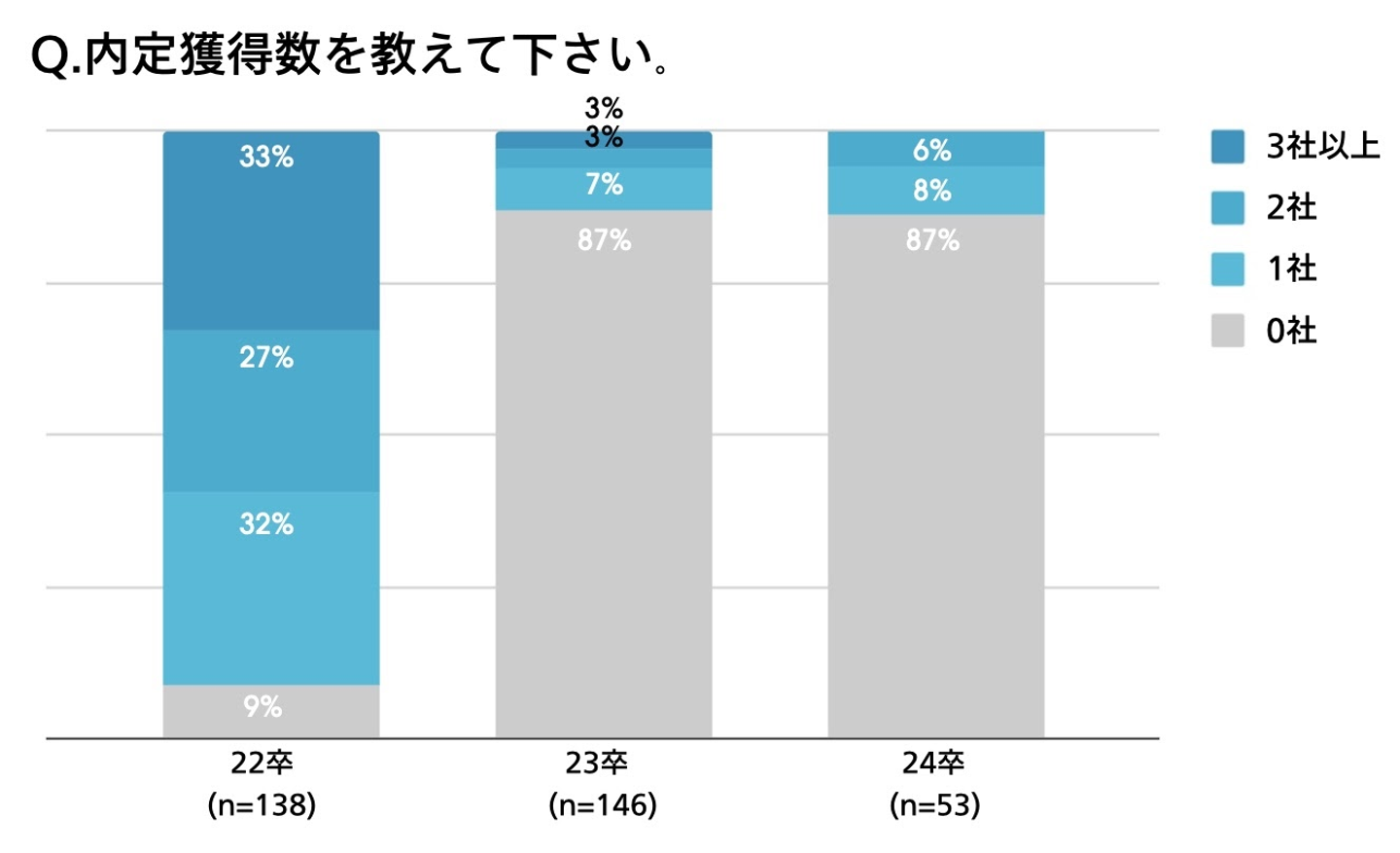 内定獲得状況について聞いた所、22卒については91%が内定を獲得しており、23卒、24卒については、それぞれ13%の学生が既に1社以上の内定を獲得しているという結果に。