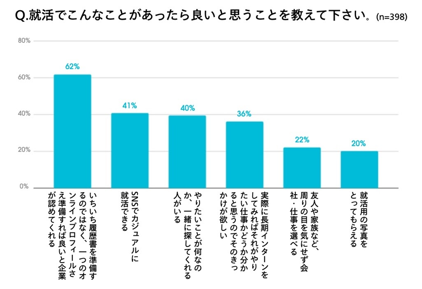 「就活でこんなことがあったら良いと思うこと」について聞いたところ、「いちいち履歴書を準備するのではなく、一つのオンラインプロフィールさえ準備すれば良いと企業が認めてくれる(62%)」が一位、「SNSでカジュアルに就活できる(41%)」が二位、「やりたいことが何なのか、一緒に探してくれる人がいる(40%)」が三位となりました。