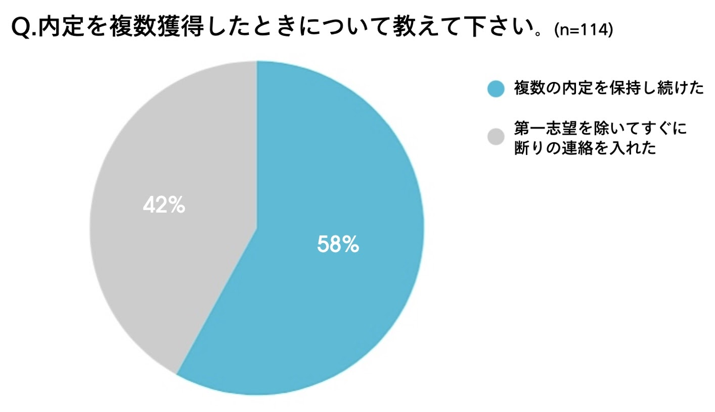 内定を複数獲得した際にとった行動について、「複数の内定を保持し続けた」が58%、「第一志望を除いてすぐに断りの連絡を入れた」が42%という結果に。
