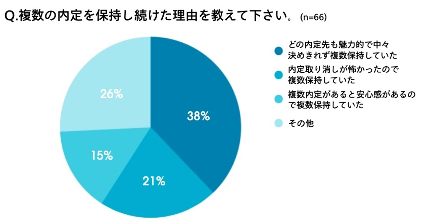 それぞれの理由についても聞いたところ、複数の内定を保持した学生で一番多かったのは「どの内定先も魅力的で中々決めきれなかった」で38%、「内定取り消しが怖かった」「複数保持していると安心感があるので」といった、就職先を失うリスクを減らしたいという理由も合わせて36%という結果に。