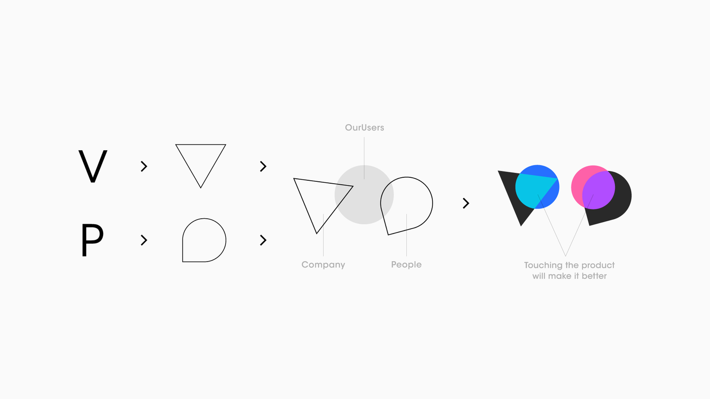 デザインプロセスとしては、まずプロダクトの頭文字のVとPをベースにシンプルな図案化。そこに「人(利用者)」を現す円を組み合わせ、重なりあう部分が変化するビジュアルに。利用者はVisitやPeopleといったプロダクトと交わる事で良い変化を得ることができる、というメッセージを込めました。