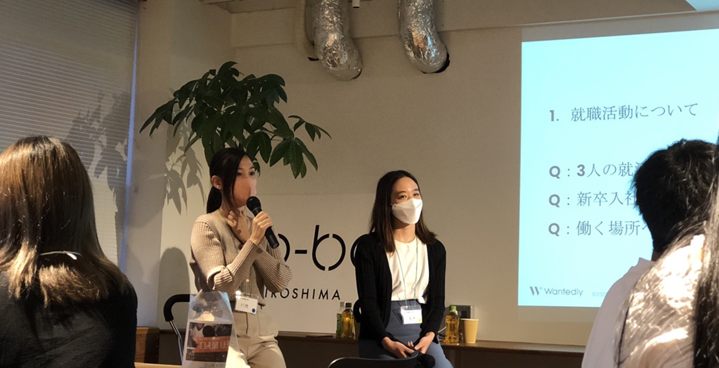イベント冒頭では、3名の社会人に登壇いただき、それぞれの就活エピソードや、1社目でのキャリア、転職の話など様々な内容でトークセッションを開催しました。