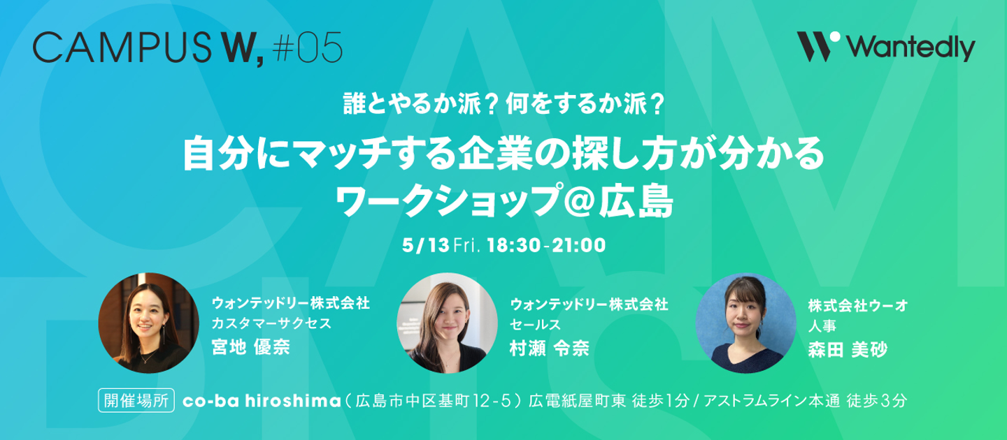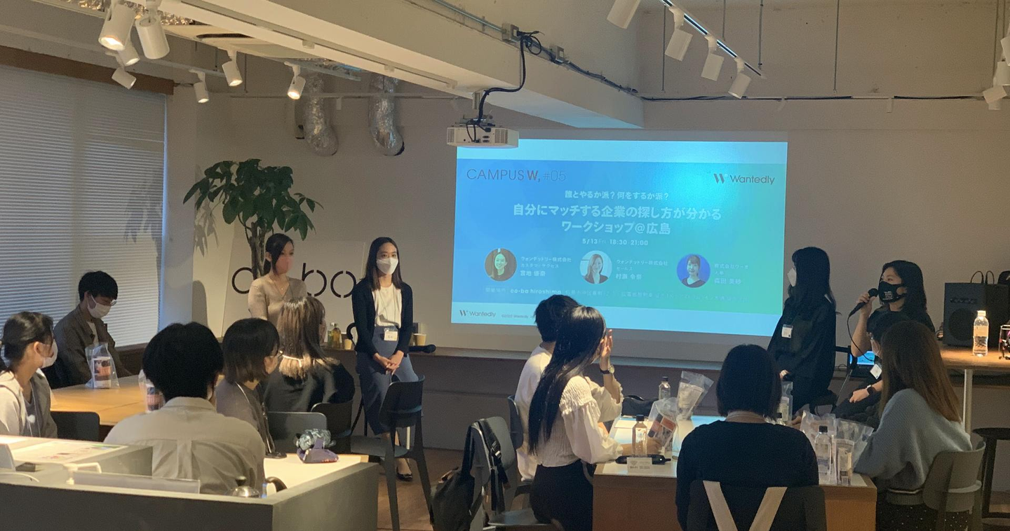 ウォンテッドリー株式会社では、学生がなるべく早いタイミングで、キャリアや仕事について考えるキッカケを提供したいという思いから、学校では学べないことを学ぶプロジェクト「Campus W, 」を毎月開催しています。今回はその一環で、広島県での開催が実現しました。