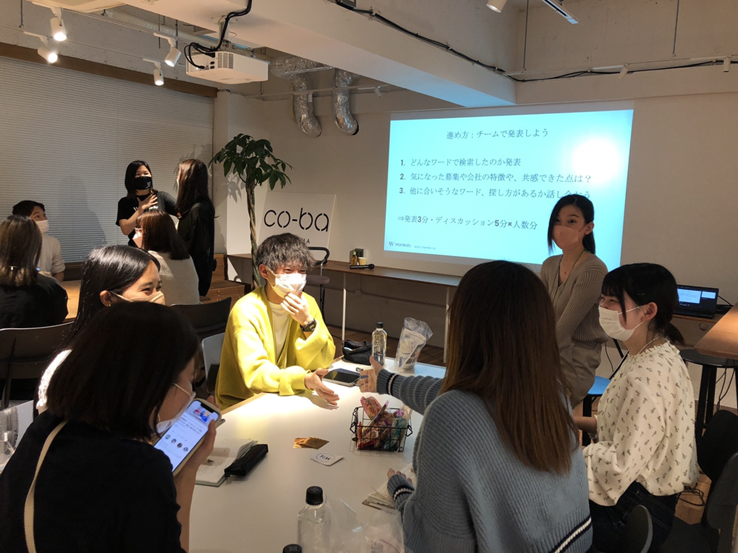 各テーブルに付いた社会人メンバーからは、「もっとこういう検索方法もあるよ」や「その軸だったら、こんな仕事も見てみると面白そうだよ」といったアドバイスはもちろん、各自の仕事について紹介するなど、学生同士だけではなく社会人と学生の交流も深めることができ、あっという間に時間が過ぎてしまいました。