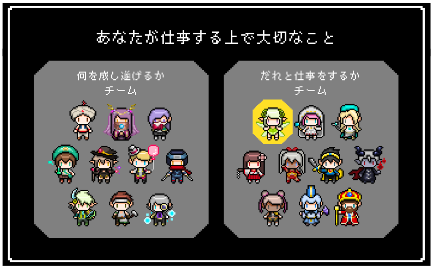 新・RPGジョブ診断では、全20種類のキャラクターに分類され、仕事をする上で大事にする傾向にある軸が2種類に分かれるのが特徴です。1つ目は「何を成し遂げるか」が大事なコトに向かうチーム。もう1つは「だれと仕事をするか」というヒトに向かうチームです。