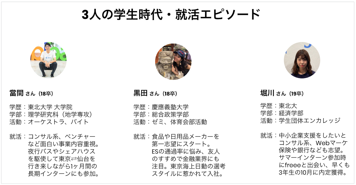 まず最初に、ゲストの皆さんの学生時代の略歴と、就活エピソードをまとめてご紹介します。三者三様の就活軸とは?