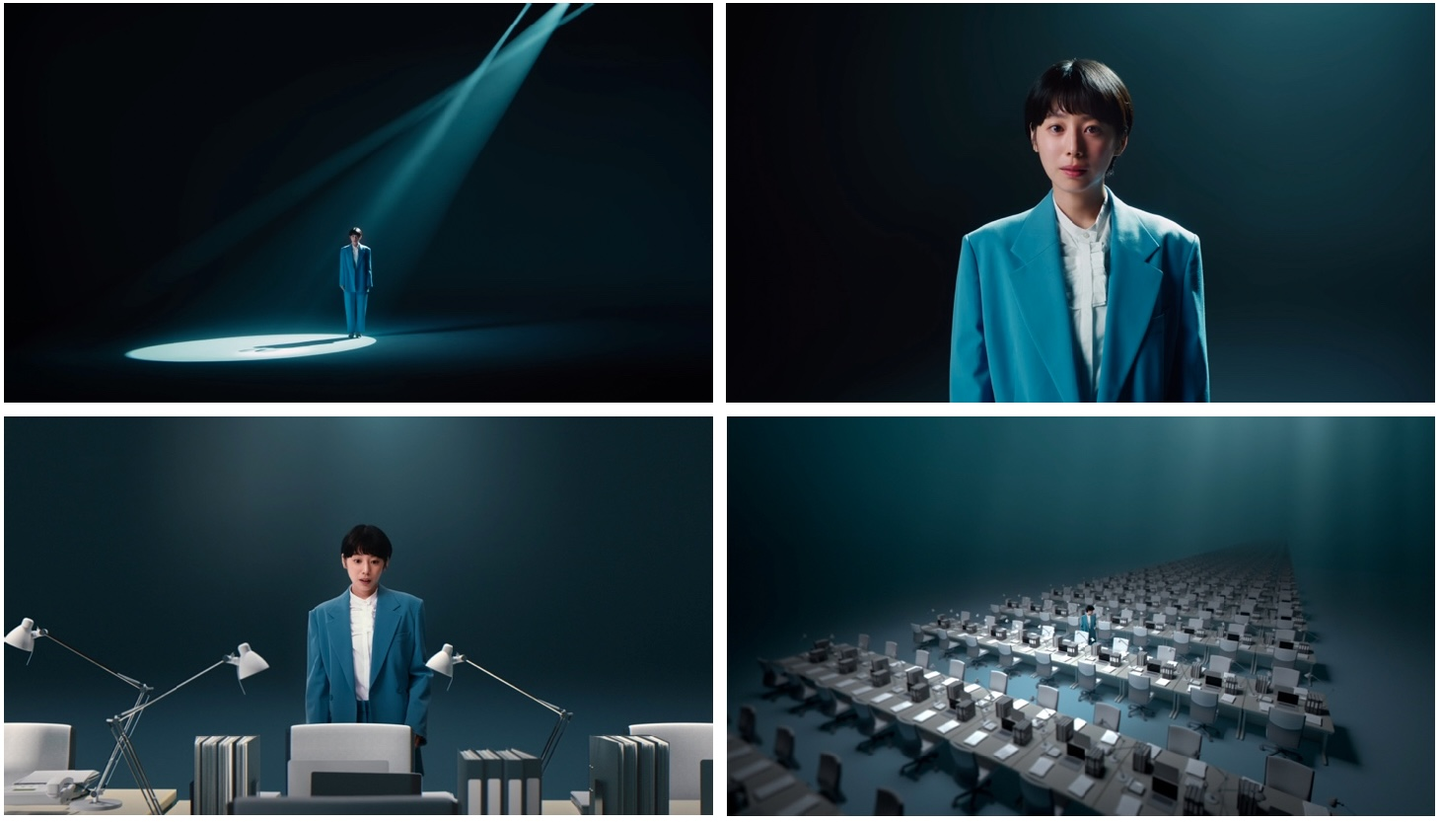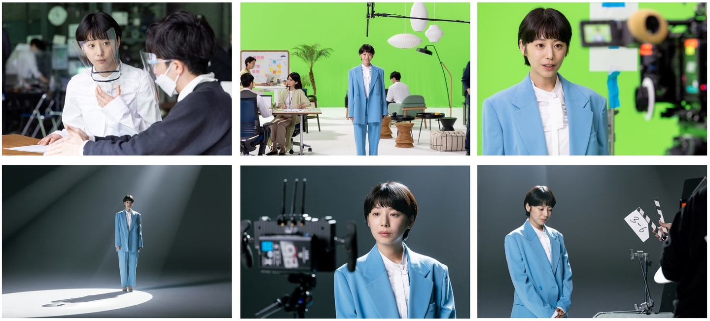 オフィスシーンの撮影では、セットの中で他の人がいる状況での撮影も1カットありましたが、ほとんど全編CGで構成されています。撮影用のグリーンバックを背景に、セットも小道具もなく、夏帆さんたった1人での撮影という状況で、監督からの状況説明と絵コンテから想像しながら行われました。どのような仕上がりになったのかは、ぜひ本編をご覧ください。