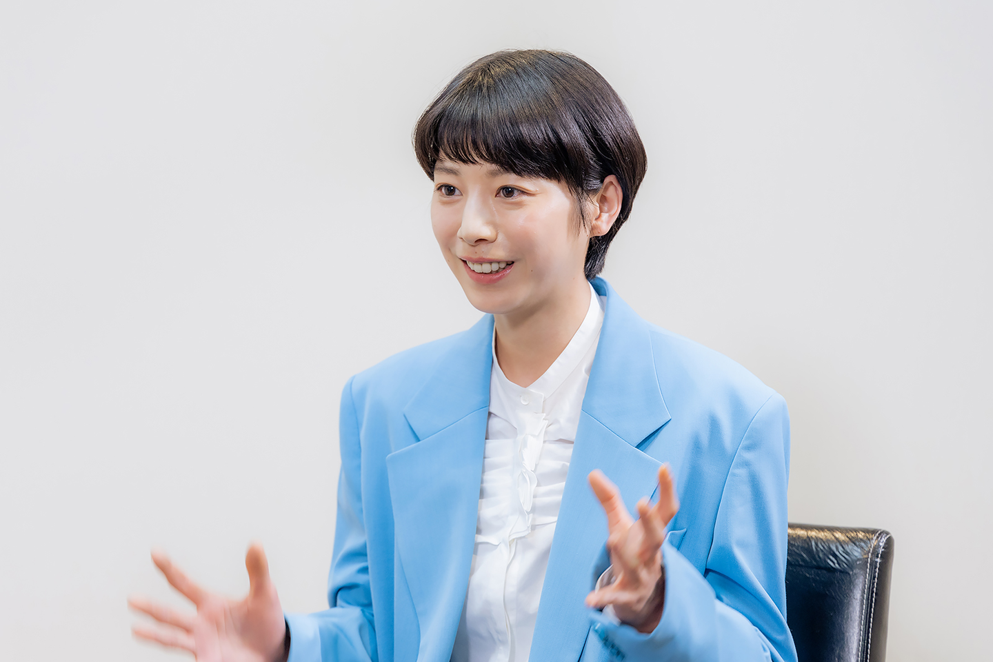 青いスーツに身を包んだ夏帆さん。がらりとイメージチェンジ。