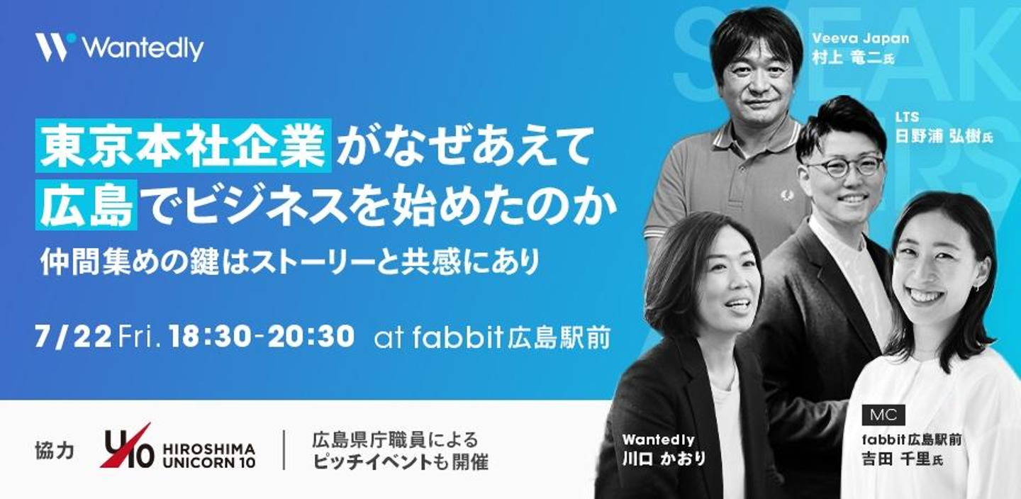 ウォンテッドリー株式会社では、2022年7月22日に「東京本社企業がなぜあえて広島でビジネスを始めたのか ~仲間集めの鍵はストーリーと共感にあり~」というオフラインイベントを、広島県庁の「ひろしまユニコーン10」プロジェクト協力のもと実施いたしました。