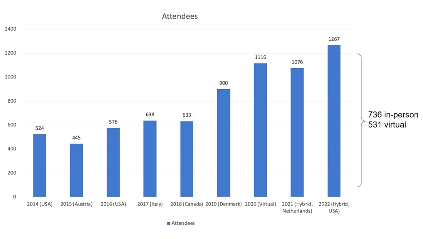RecSys は今年で16度目の開催となります。前述の通りハイブリット方式で開催されていることによって多くの人が参加していました。今年の参加者数は過去最高の1,267人となり、現地参加者数は736人と去年から2倍近く増加しています。