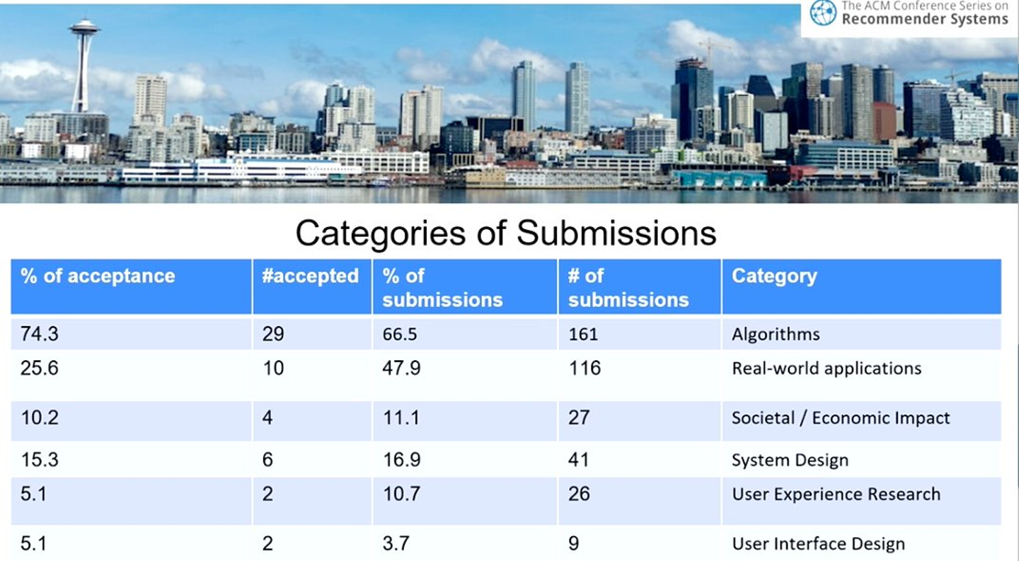 今年の論文投稿数は242本であり、採択率は16.1%でした。投稿論文のカテゴリ別に見てみると、去年に引き続き "Algorithms" が非常に人気のあるトピックになっています。しかし "Real-world applications" や "Societal / Economic Impact" や "User Experience Research" など実社会や実サービスにおける推薦システムに関する論文も多数投稿されていました。