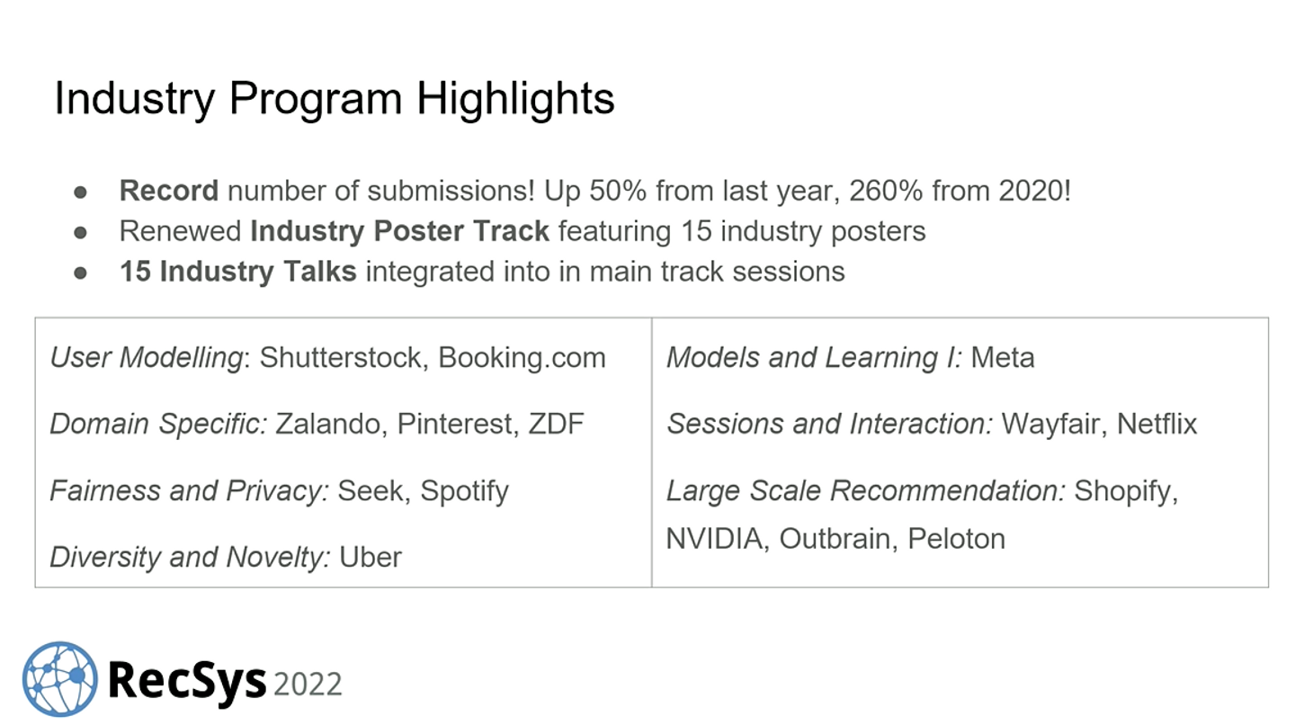 企業の講演である Industory Talks では、実サービスで推薦システムを開発・導入・運用して直面する課題やそこから得られた知見についての発表が行われます。こちらは去年から投稿数が50%も増加しており、産業界における推薦システムの実応用や運用が現在進行形で盛り上がっていることが分かります。