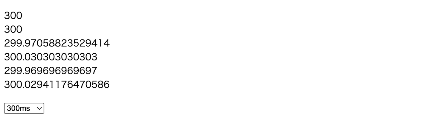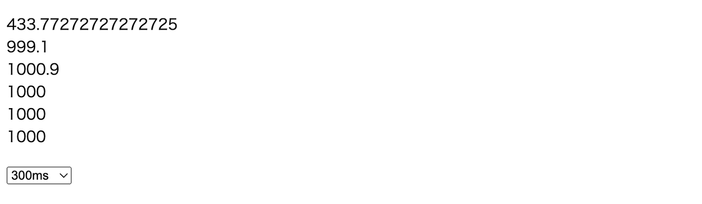 一方、タブをバックグラウンド化 (別のタブに移動) して1分ほど放置してから戻ってくると、このような表示になります。これは1秒に1回まで間引かれていることを意味しています。 (Mac上のGoogle Chromeの例)