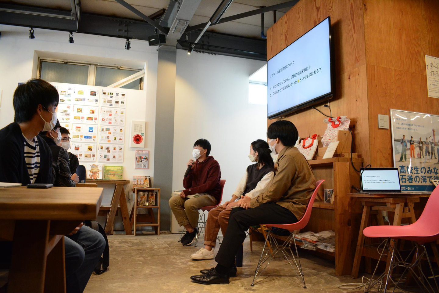 イベント冒頭では、仙台や石巻などの宮城県にゆかりのある3名の社会人に登壇いただき、それぞれの就活エピソードや、1社目でのキャリア、転職の話など様々な内容でトークセッションを開催しました。