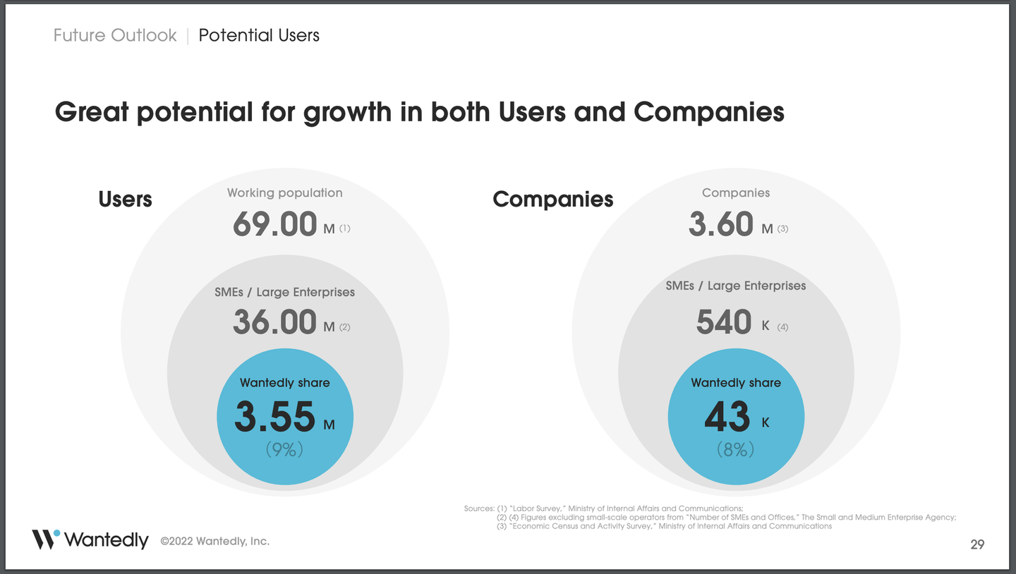 またユーザー・企業の双方に大きな成長余地があります。2022年10月時点において、日本国内の労働人口6,900万人のうち当社シェアは9%、日本国内の企業数360万社のうち当社シェアは8%となっています。