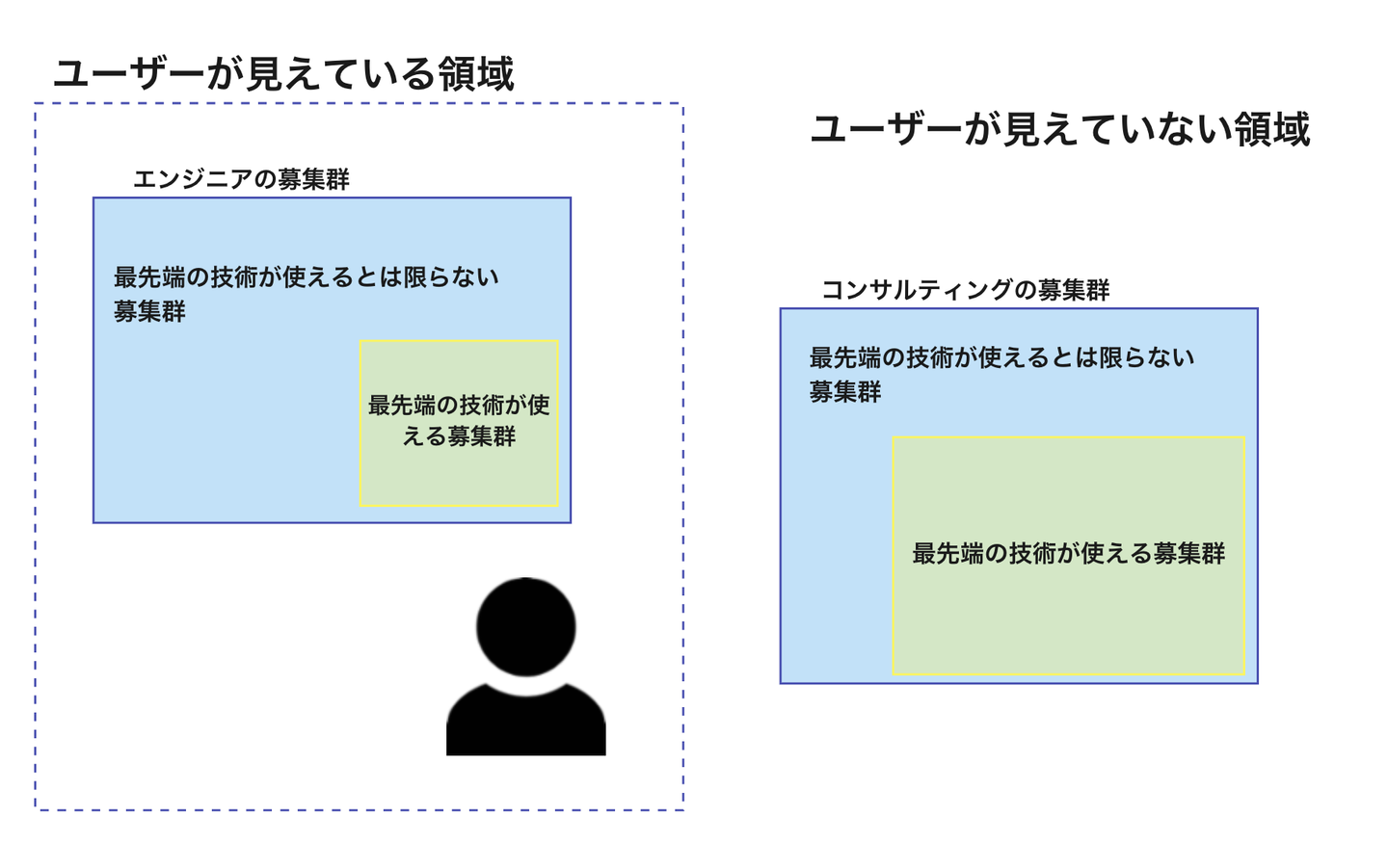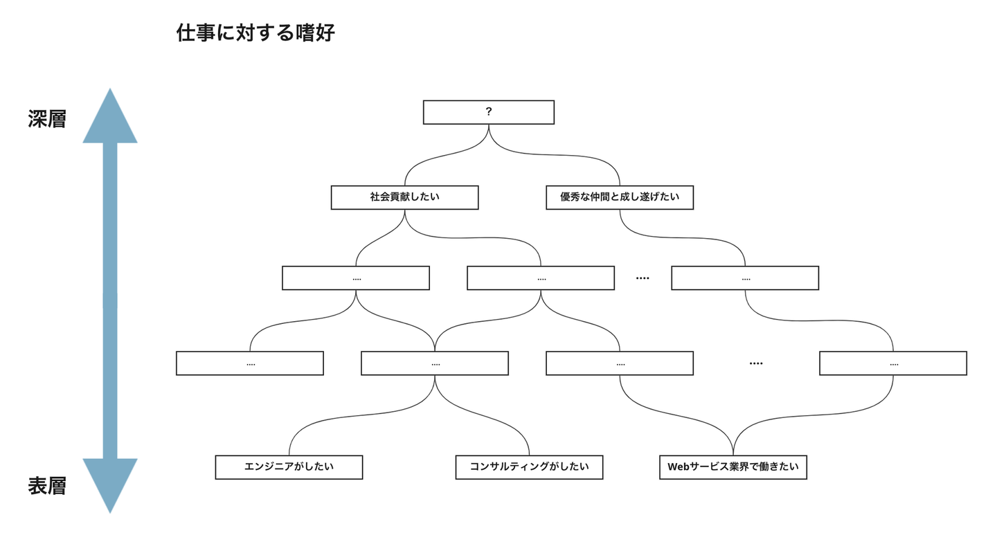 例えば「エンジニアをやりたい」というユーザーがいたとします。ユーザーは「エンジニア」を軸に仕事を探していますが、実は彼自身の本当にやりたいことは「常に最先端の技術に触れたい」でした(仕事を探している時点では分かっていない)。数あるエンジニアの募集には最先端の技術を活用する仕事もあればそうでない仕事もあり、ユーザーは後者の仕事と出会って転職しますが、なにか自分のやりたいことと違う、とモヤモヤを抱えます。