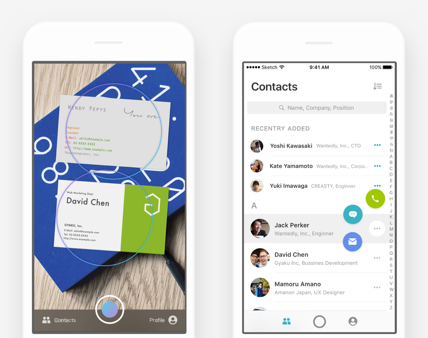 「Wantedly People」は、複数枚の名刺をスマートフォンのカメラで同時に読み取り、瞬時にデータ化でき