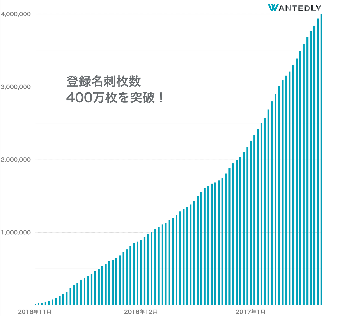 ウォンテッドリーは日本発のビジネス SNS として、活発 な「シゴト交流」を提供するため、企業訪問サービス 「Wantedly Visit」や、チャットサービス「Wantedly Chat」などをリリースして参りました。名刺管理アプリ 「Wantedly People」は、2016 年 11 月にリリースして から約 2 ヶ月で登録名刺枚数が 400 万枚を突破し、ビジネ ス SNS「Wantedly」の中でビジネス上のつながりを加速/ 拡大させ、自身のつながりを資産に変えるサービスとして の中心的役割を担っています。