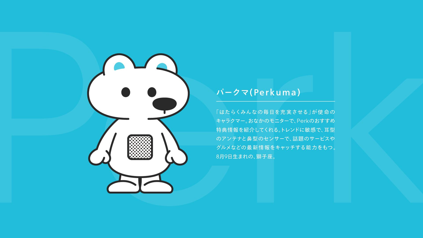 パークマは、当社が提供する福利厚生サービス「Perk(パーク)」をもっともっと広めて、はたらくみんなの毎日を充実させたいと思っている“キャラクマー”です。
