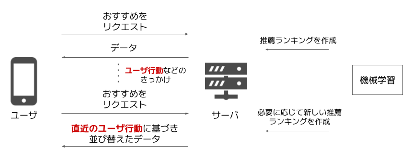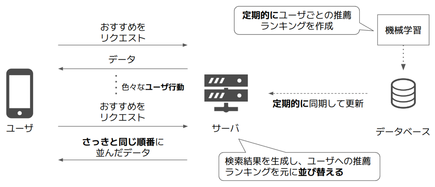 - 少し経ってから、再びユーザサイドから同一の検索リクエストが到着する(★このタイミングで機械学習モデルによってランキングがリアルタイムに計算される)