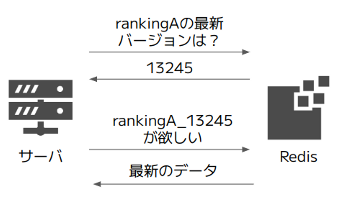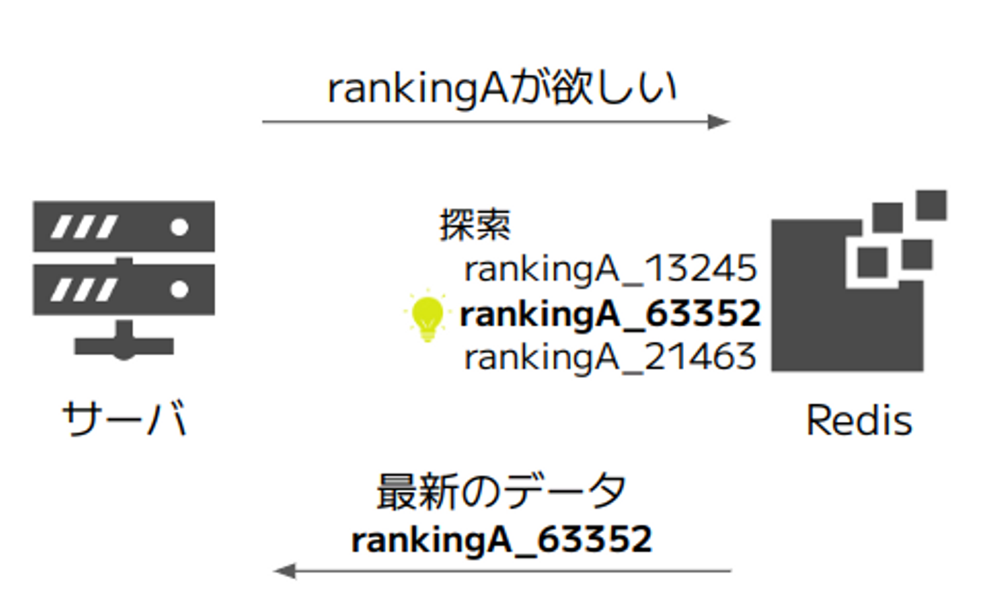 データベース (Redis) に保存する key:value の組として rankingName:latestVersion と rankingKey:rankingData の2種類を用意することによって、例えば rankingA の最新のデータが欲しいときにはまず rankingA でRedisを検索して最新バージョンを文字列として取得し、それを末尾に付与して構築したキー文字列 (rankingKey) で再びRedisを検索することでランキングのデータ本体を得るという2段階の構造になっています。この方式だとデータ取得が2段階になるためそれらの時間差に伴う不整合が起きないように注意する必要がありますが、全ての処理がO(1)であるという他にはない利点があるため、実行時間の観点からこの方式を採用することにしました。