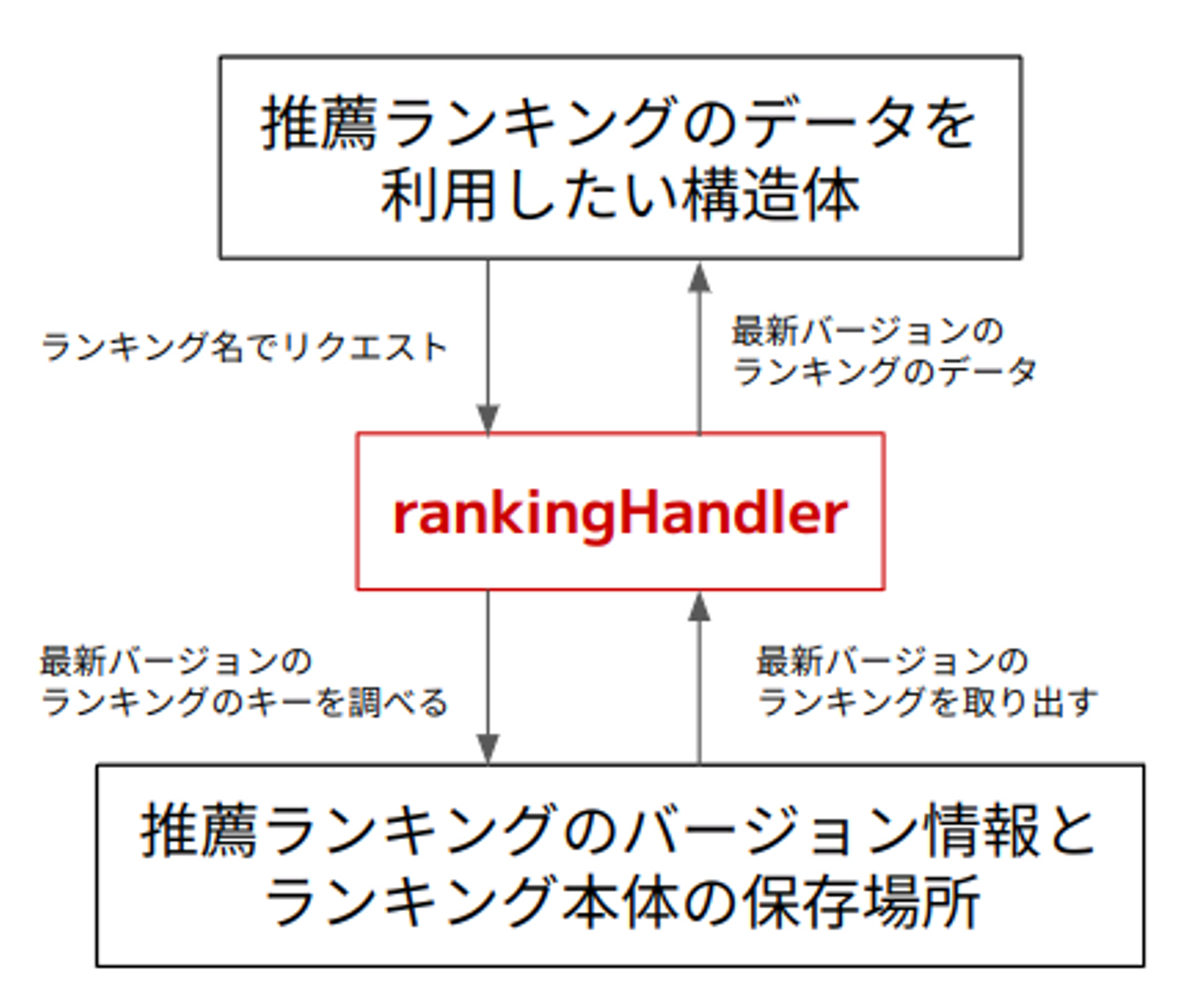 ランキングのデータに正しくバージョンを付与し、最新バージョンの取得も出来るようになったことで一応のプロジェクト目標は達成されましたが、「まず最新バージョンを取得し、次にキーを構築してランキングのデータ本体を取得する」というロジックはコードを一見しただけでは理解しにくいということが課題に感じました。そこで、推薦基盤に新しく rankingHandler という構造体を導入し、これに最新のランキングを解決するメソッドを実装することで、ランキングのデータを利用する側はランキング名だけ指定すれば自動的に最新バージョンが得られるようにしました。これによって、ランキングのデータにはバージョン情報が付与されており最新版を取ってくる必要があることや、ランキングのデータが実際に保存されている場所などの詳細を隠蔽することができ、誤った扱い方をしてしまうリスクが低くなりました。
