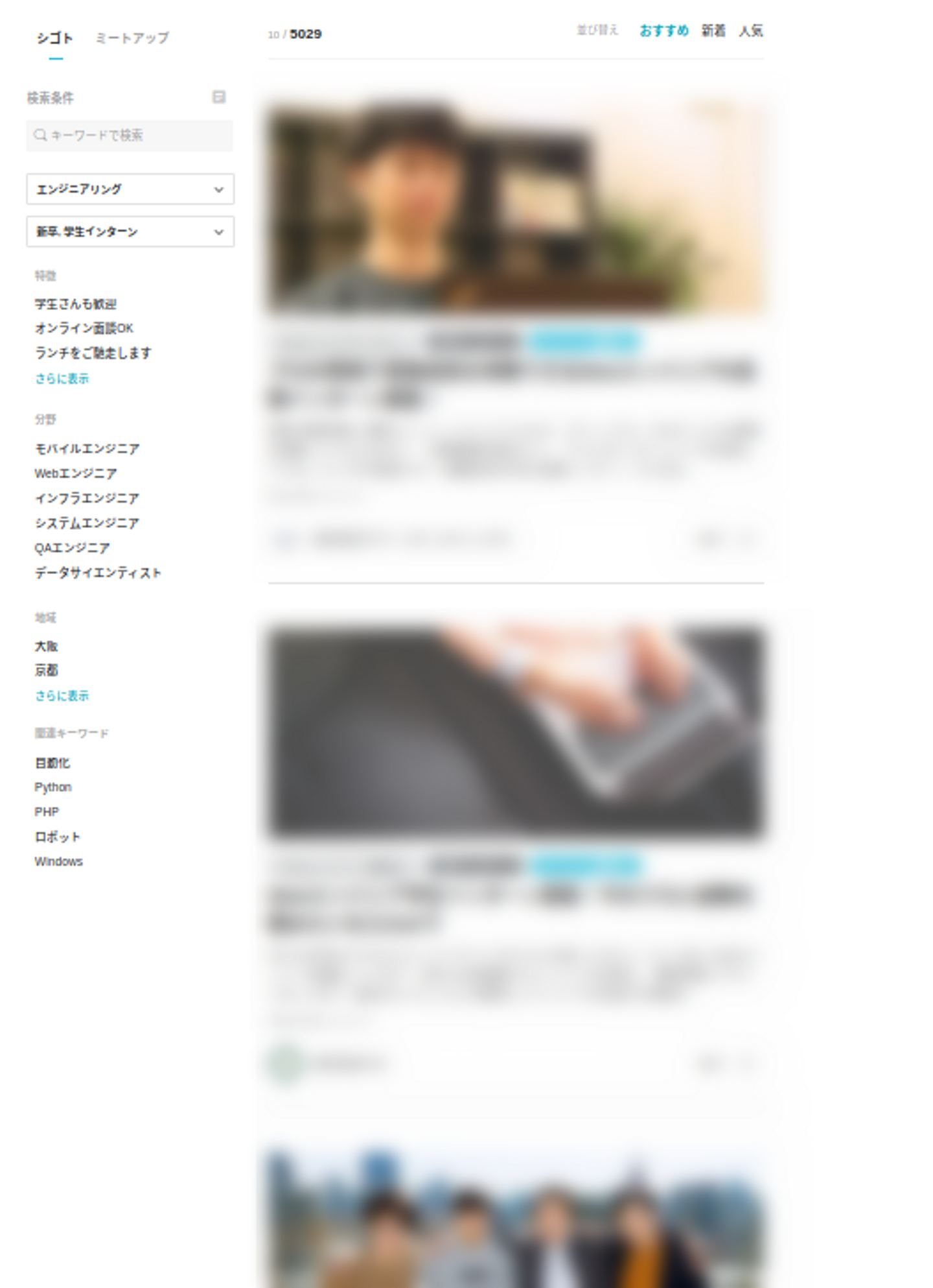 Wantedlyでは、募集のトップページの検索機能(下図)などにおいて、多数ある募集を条件に基づいてフィルタリングした上でさらに「ユーザへのおすすめ順」に並べ替えることがよくあります。言うまでもありませんが、上に表示されたものほどユーザの目に留まる可能性が高いため、その時々のユーザの興味関心に合った並び替えをすることは極めて重要です。
