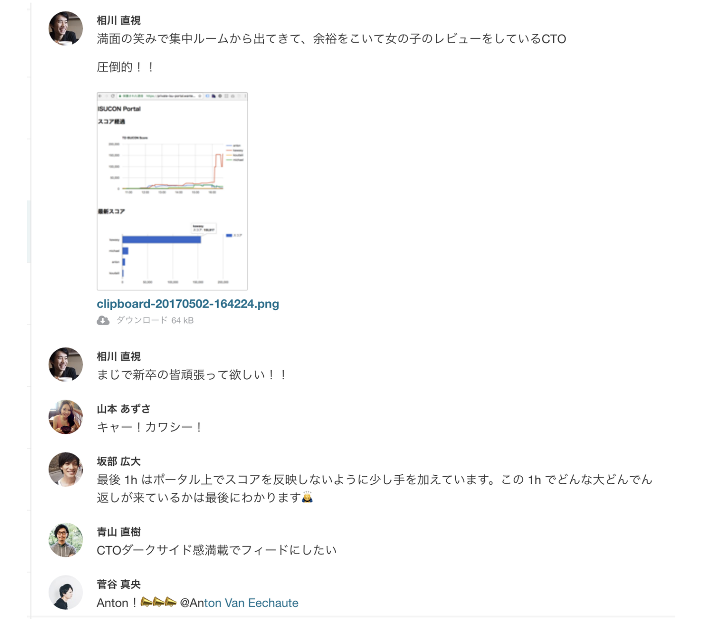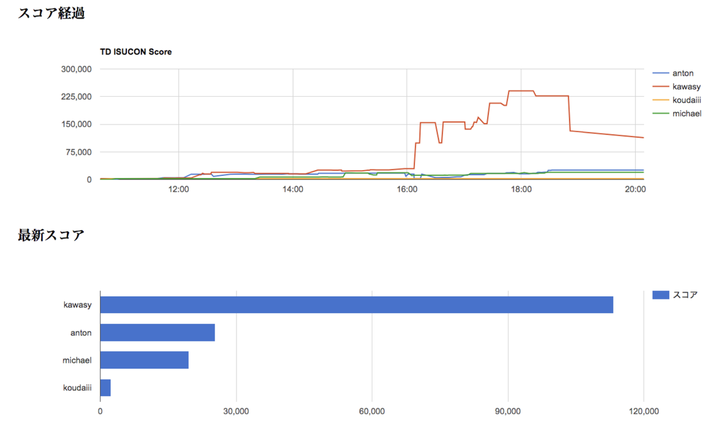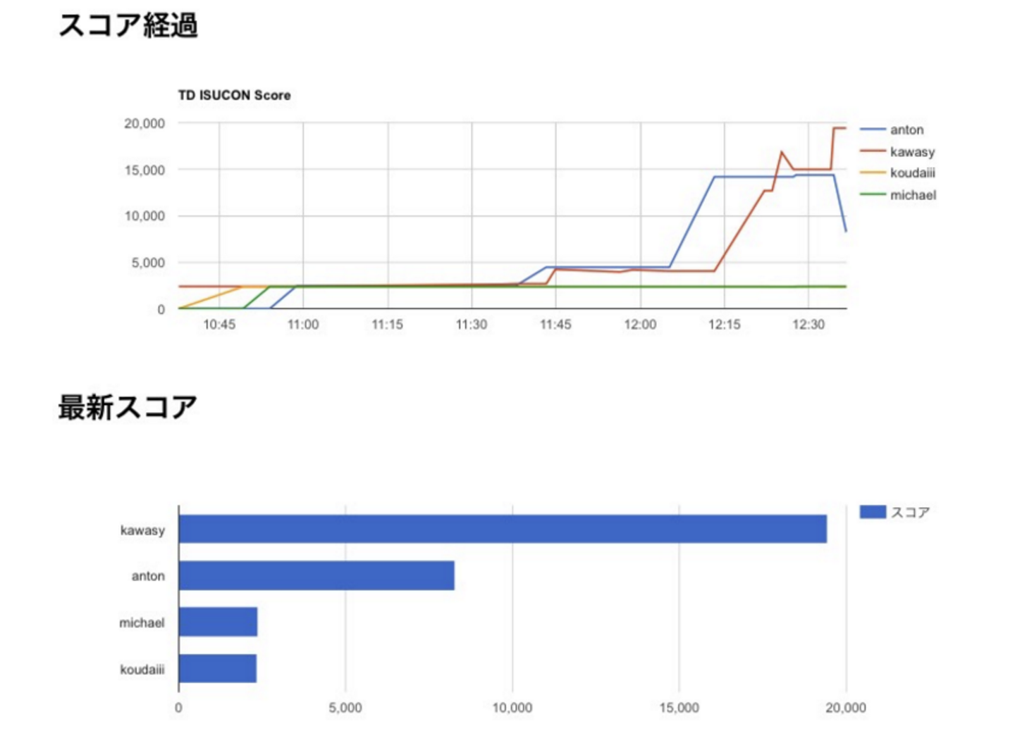 12:30時点での途中経過がこちら。すでにCTOの川崎 (kawasy) が一歩抜けだしています。もう一方の新卒の チーム (anton) も善戦しています。