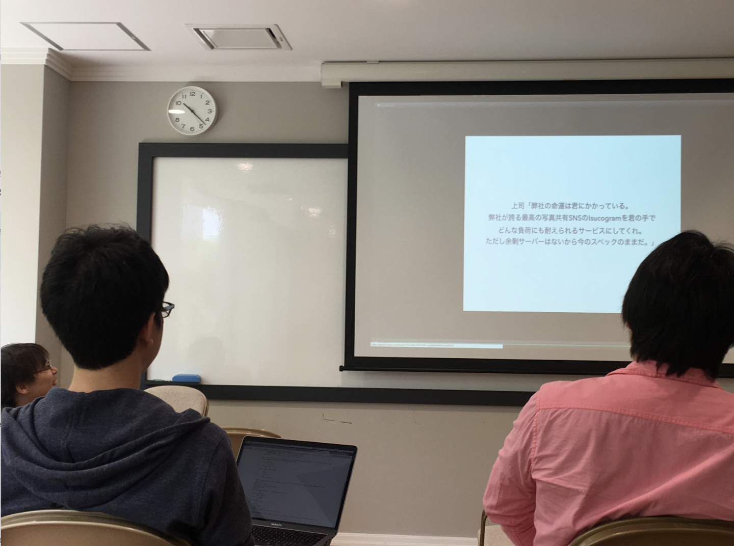 僕たち新卒メンバーは4月に通常の業務を行うかたわら、研修として夕方の1~2時間でビジネスマナーから数値目標の建て方、エンジニアとしての基礎知識など多岐にわたる内容を学んできました。その中で今年は技術的な研修がやや少なかったこともあり、研修の締めくくりとして社内ISUCONを行うことになりました。問題は pixiv さんが社内ISUCON用に作った問題 を使わせていただきました。