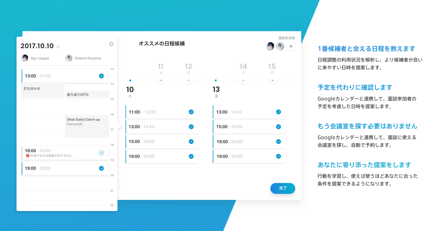 今回の新機能では、Google カレンダーと連携することで採用担当者や会議室の空き状況が優先され、採用担当者のこれまでの面談設定時間も合わせて日程候補が提案されます。さらに、ユーザーの利用データから候補者により“会える”日程が学習され、候補日に反映されます。使えば使うほどより多くのデータから採用担当者と候補者の両方にとって最適な日程が自動で割り出されるようになり、提案される日程の精度が上がっていくため、採用担当者の手間を省きながら、企業がより多くの候補者と出会える機会を増やしていきます。