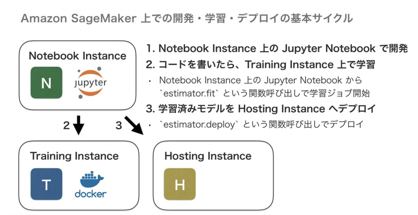 (学習やデプロイについては、厳密には専用 instance を立てずに利用する機能も用意されていますが、それらは基本的にデバッグ用途であり中心的な使い方は「専用 instance を利用する」というものです)