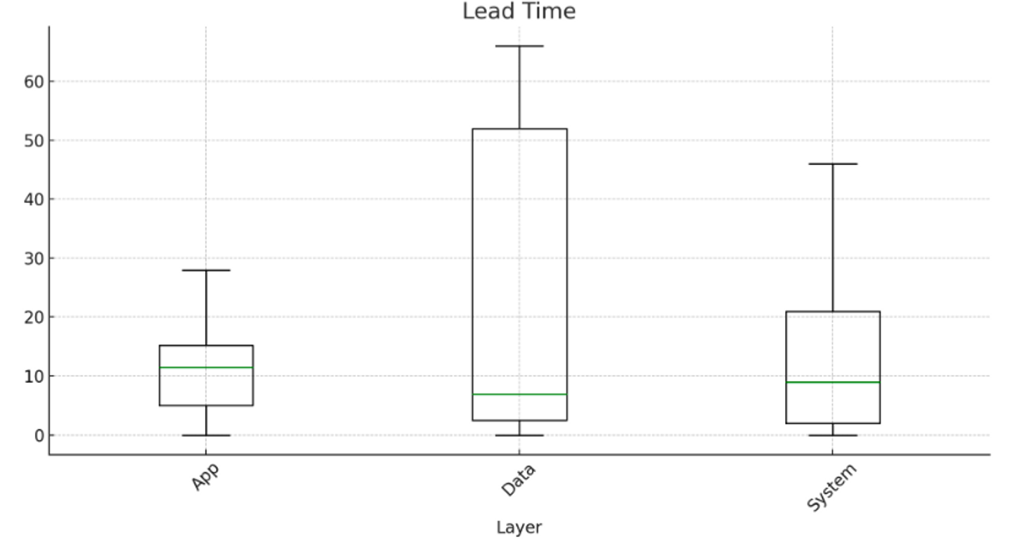 以下はリードタイムを箱ひげ図にしたものです。ヒゲの長さは (Q3-Q1)*1.5 を上限とし、その範囲外を外れ値としました。