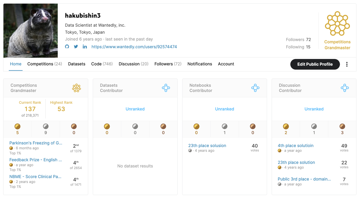 2018年12月に Expert、2019年10月に Master、2023年6月に Grandmaster になりました。15回コンペに参加して、金メダル5枚、銀メダル9枚を取得しました。