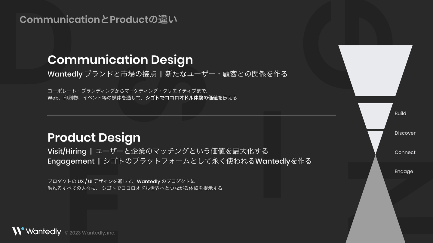 ウォンテッドリーのデザイン組織は「Communication Design Team」と「Product Design Team」が一緒の組織に属しています。