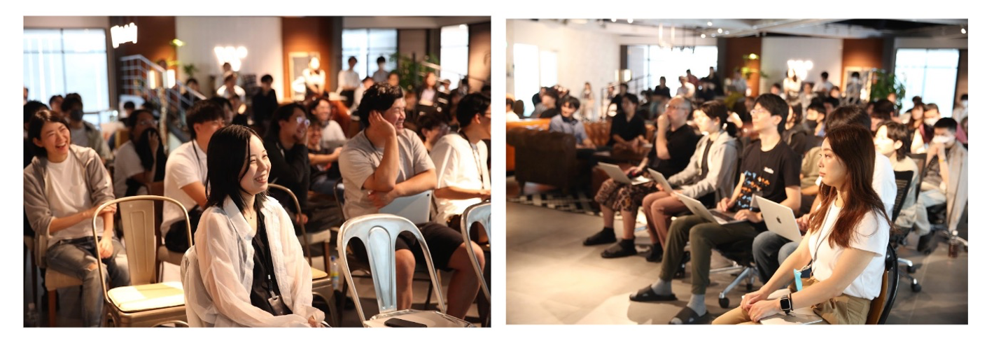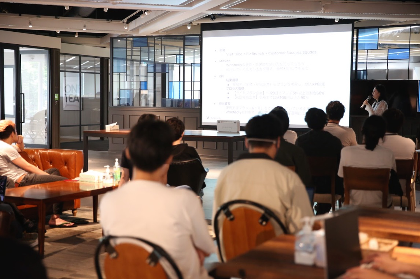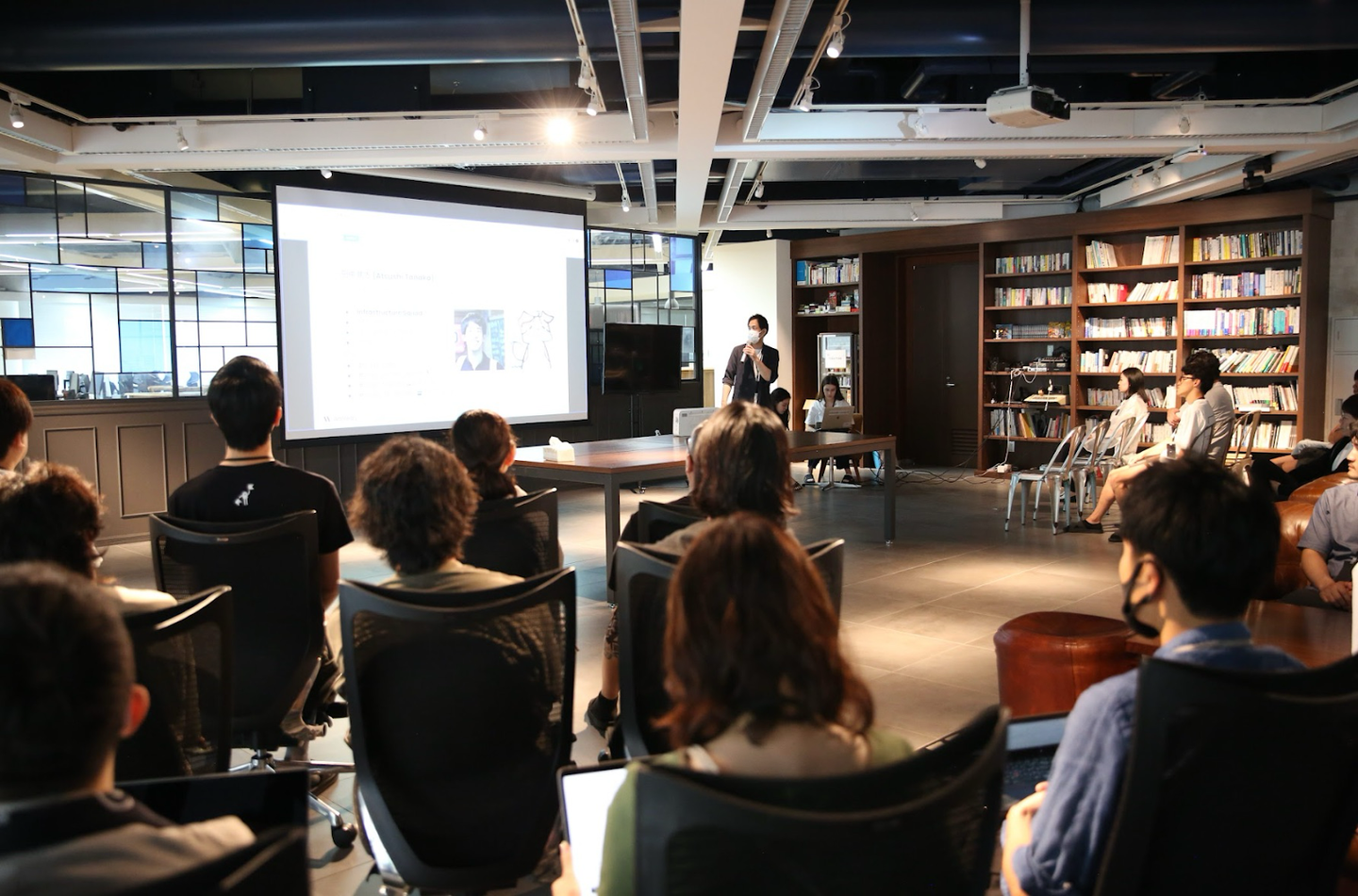ウォンテッドリーの組織は Dev / Biz / Corp という3つの Branch で構成されており、オフィスのフロアも4階と5階で分かれています。しかし、この Demo Day の時間では全員が同じフロアに集まり、オフラインでメンバーの発表を聞きます。