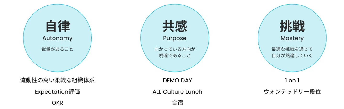 ”シゴトでココロオドル” 状態とは、没頭することで成果を出し、成果によって成長を実感すること。と定義しています。そして "没頭" するためには、「自律」「共感」「挑戦」の3つの要素が必要であると考え、組織の設計に反映させています。