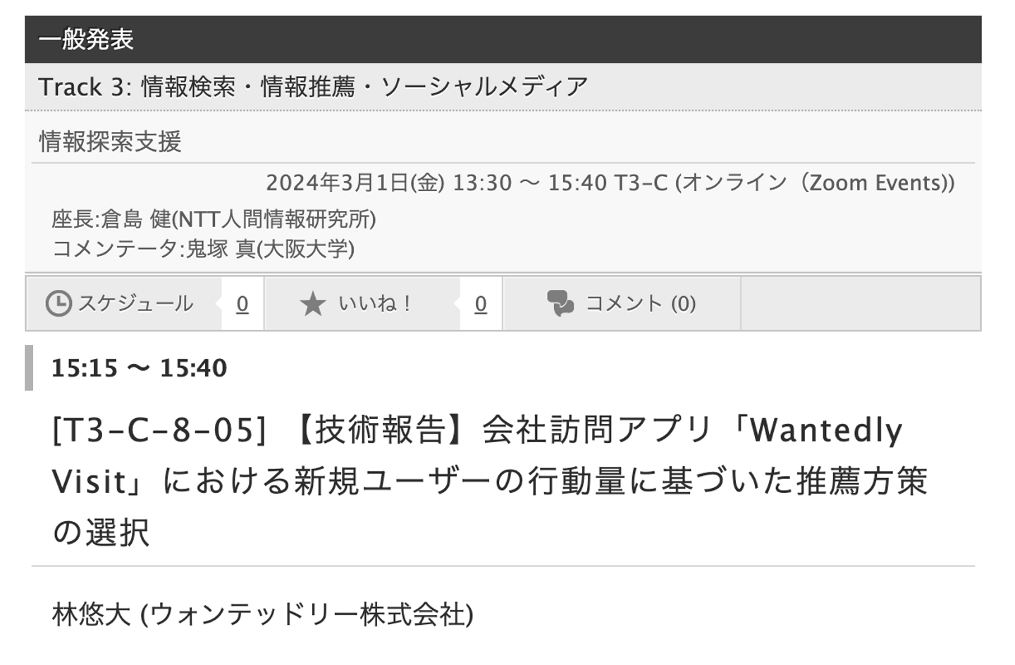 【発表者の林さんのコメント】3日目の情報探索支援のセッションにて、ウォンテッドリーにおける新規ユーザーに対する推薦方策の選択について技術報告いたします。サービス利用開始直後のユーザーは既存ユーザーと比べてこれまでの行動ログの蓄積がなく、よいコンテンツを推薦するのが難しいユーザー群です。一方で、新規ユーザーは募集を探して応募したいという意欲が高い層でもあり、良い体験を提供することがその後の継続したサービス利用にとっても非常に重要になります。今回の報告では、ユーザーの行動量に応じてコンテンツベース推薦と行動ベース推薦の切り替えを行うことで新規ユーザーの体験を向上させた事例についてご紹介します。是非ご聴講ください。