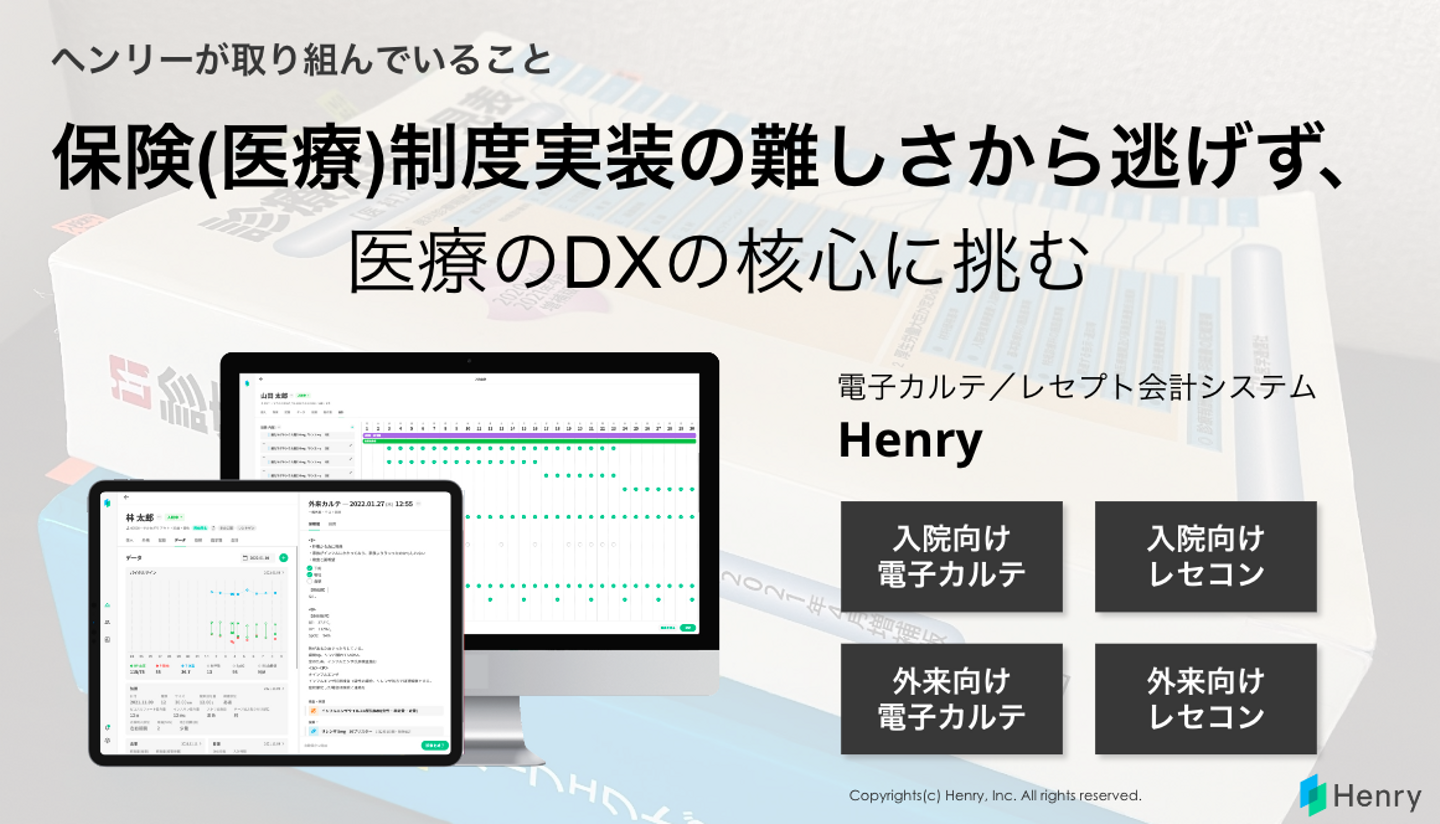青柳さん:ヘンリーは「社会課題を解決し続け、より良いセカイを創る」をミッションに掲げている会社です。数ある社会課題の中から、現在は「医療業界の業務改善」を実現するために活動しています。具体的には、電子カルテ/レセプト会計システムの開発・提供を行っており、医療DXの革新に挑んでいます。
