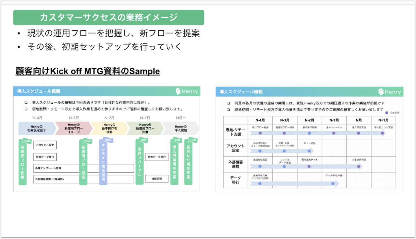 青柳さん:わかりやすく言うと「カスタマーサクセス」に近いですね。当社のシステム導入先の方々に、システムをきちんとお使いいただけるようになるためのサポートをしています。SaaSは、導入初期のサポートが欠かせません。当社の場合ですと、おおよそ4ヶ月かけて、使い方をご説明したり、初期のセットアップを行っています。時間をかけて進めていくので、プロジェクトマネジメントのような動きをするほか、時には業務効率化のアドバイスを行うこともあるので、業務改善コンサルのようなことも行っています。