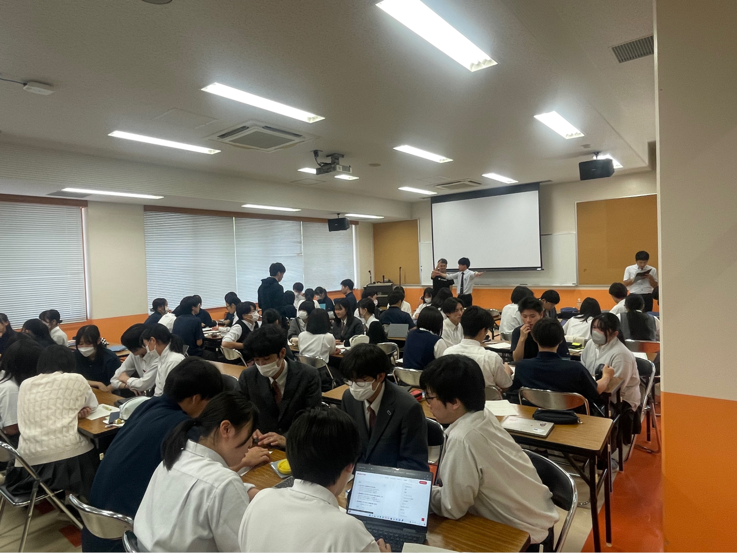 講演会には高校や大学との連携を担当する村岡と貴船が参加。プレゼンテーション講座の部分を担当したほか、生徒さんのプレゼンテーションに対するフィードバックも行いました。