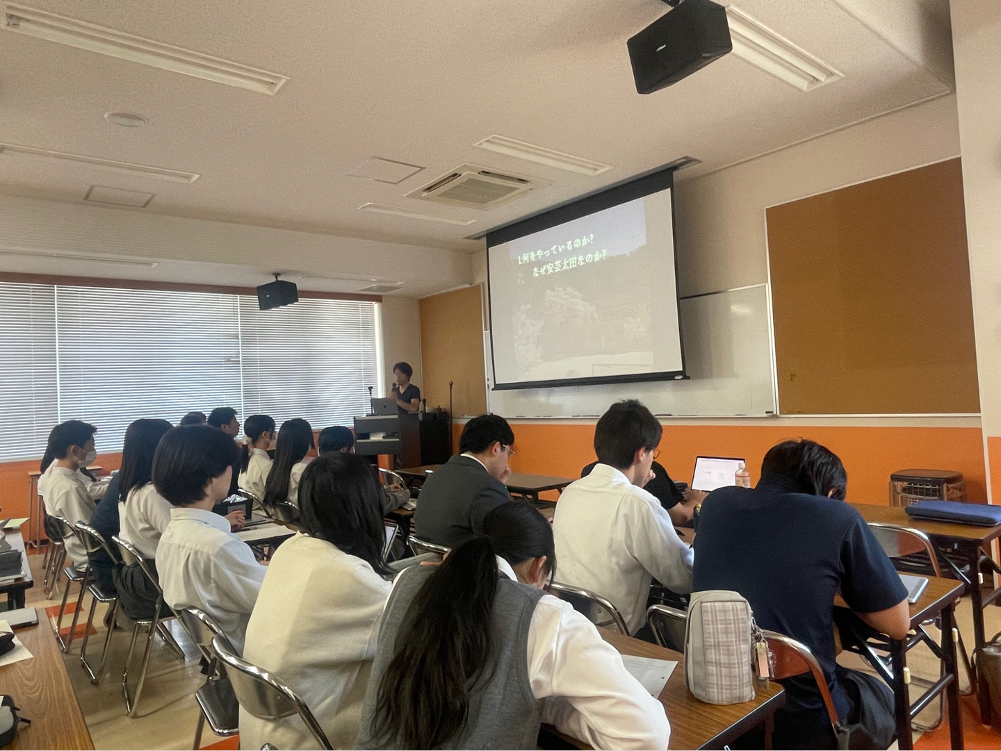 今回の講演会は、広島県安芸太田町で起業したForema社の小泉氏に講演をしてもらうことで、県内外から入学した生徒に町内でできる仕事を知ってもらい、将来の選択の幅を広げてもらうために、ウォンテッドリーと加計高校で企画しました。また、校長先生から「プレゼンテーション能力や話す能力を養うことで、探究活動の発表会や推薦入試の場面で役立ててもらいたい」というリクエストもいただいたことから、併せてプレゼンテーションの講座も行いました。