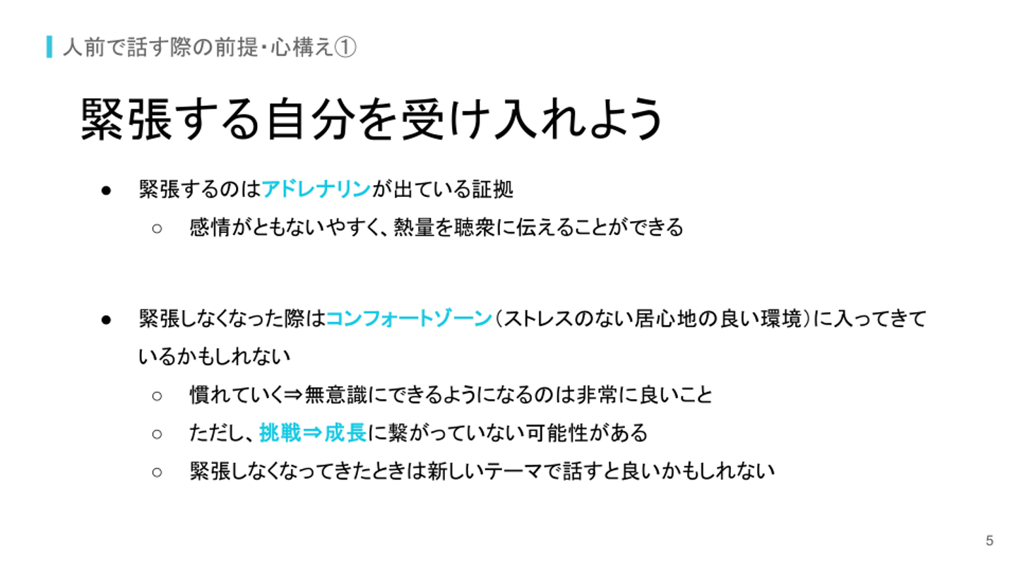 続いて村岡からはプレゼンテーションをする際の心構えやコツについて、生徒さんにお伝えしました。人前で話す際の前提・心構えとしては、緊張する自分を受け入れることや 聴衆の属性を意識すること、与えられた時間を守ることが伝えられました。話し方で意識(訓練)して欲しいこととしては、なるべく聴衆に視線を合わせることや、自信があるようになるべく見せること、話す順番が挙げられました。