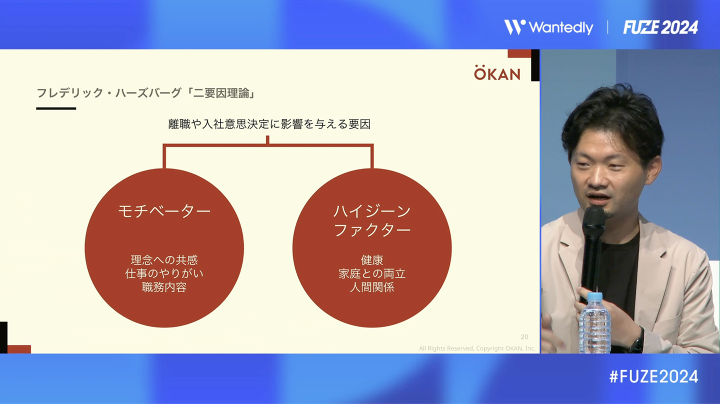 「生産性の向上と離職率の低減。これらがエンゲージメント施策を行う目的です。そのためにも社員のモチベーションを高めていくことが求められますが、それだけでは不足しています。例えば、どれだけ会社の理念に共感しても、健康でなくなったら働き続けられないですよね。社員の定着という観点でいえば、モチベーター(理念への共感や仕事のやりがいなど)に加えて、ハイジーンファクター(健康や家庭との両立など)との両立が不可欠になります」(沢木さん)