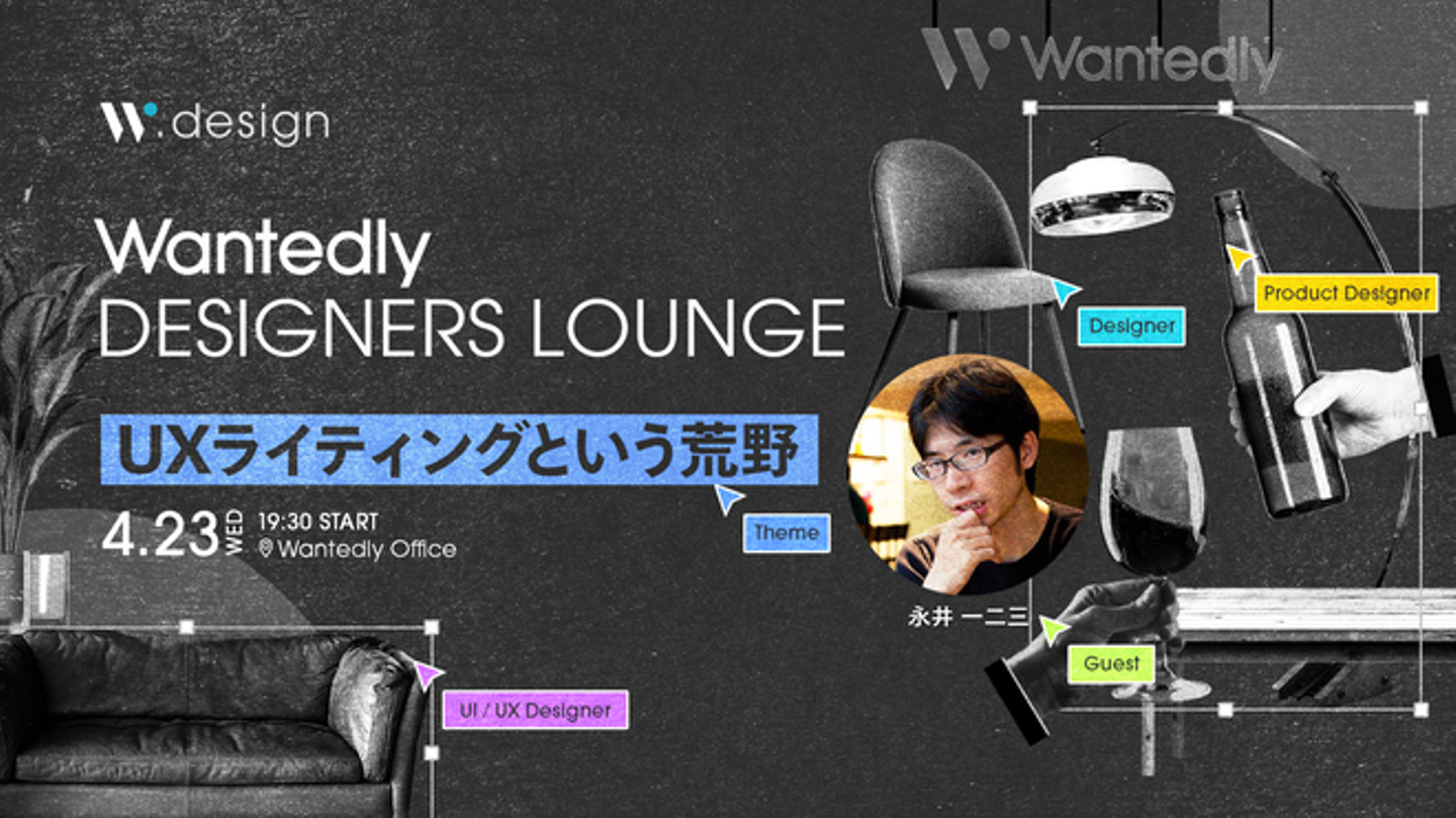 04月23日(水) に開催予定の「Wantedly Designers Lounge」のテーマは「UXライティングという荒野」。UXライター兼コピーライターの永井さんをゲストとしてお招きして、UXライティングに関係するあれこれを参加者の皆さんと一緒に雑談していきます。