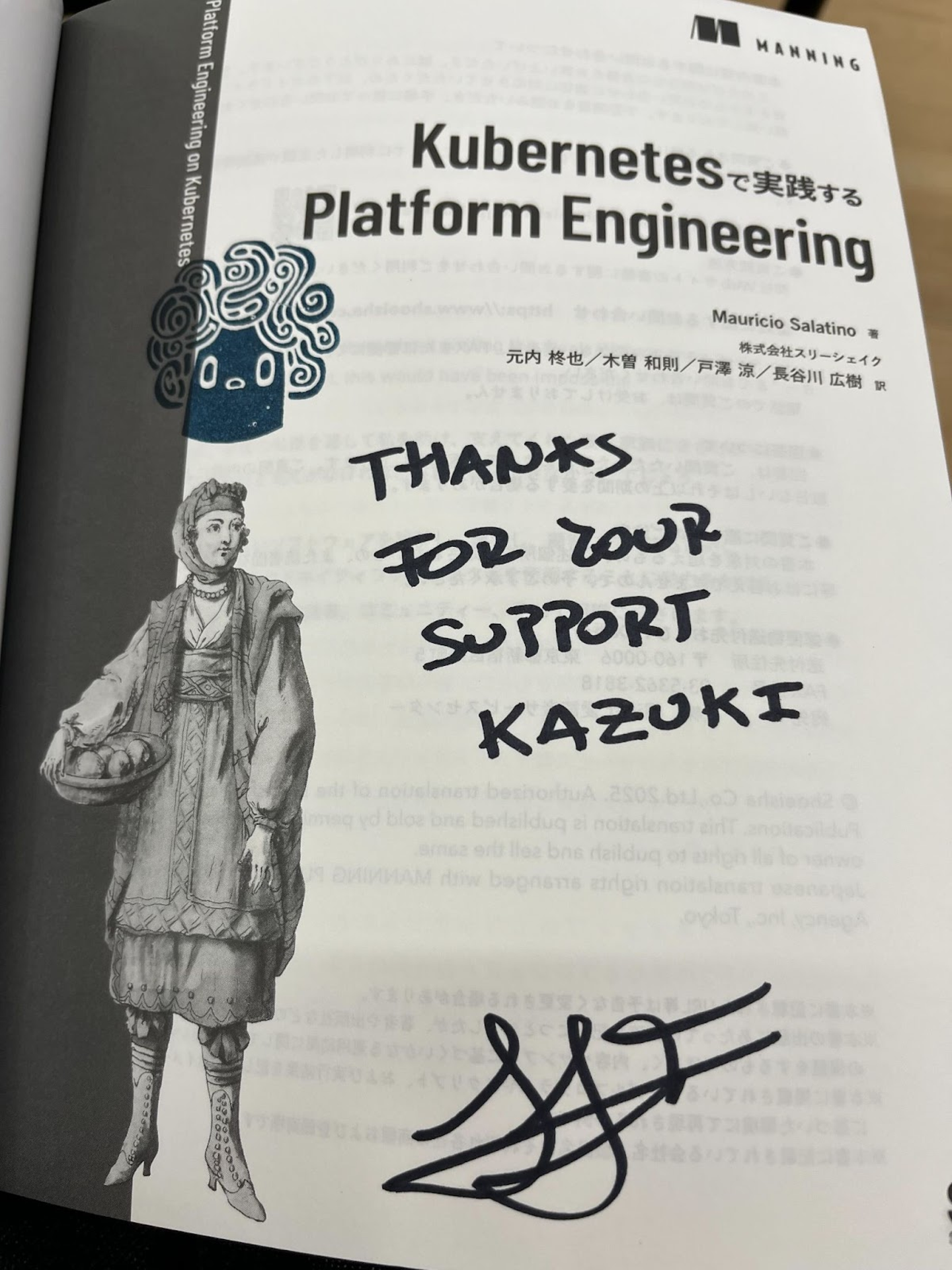 余談ですが、「Kubernetesで実践する Platform Engineering」の抽選会に参加し、本をいただきました。著者である Mauricio Salatino さんからサインまでいただくことができました。少し読んだのですが、7章と8章が実践的で良かったです。