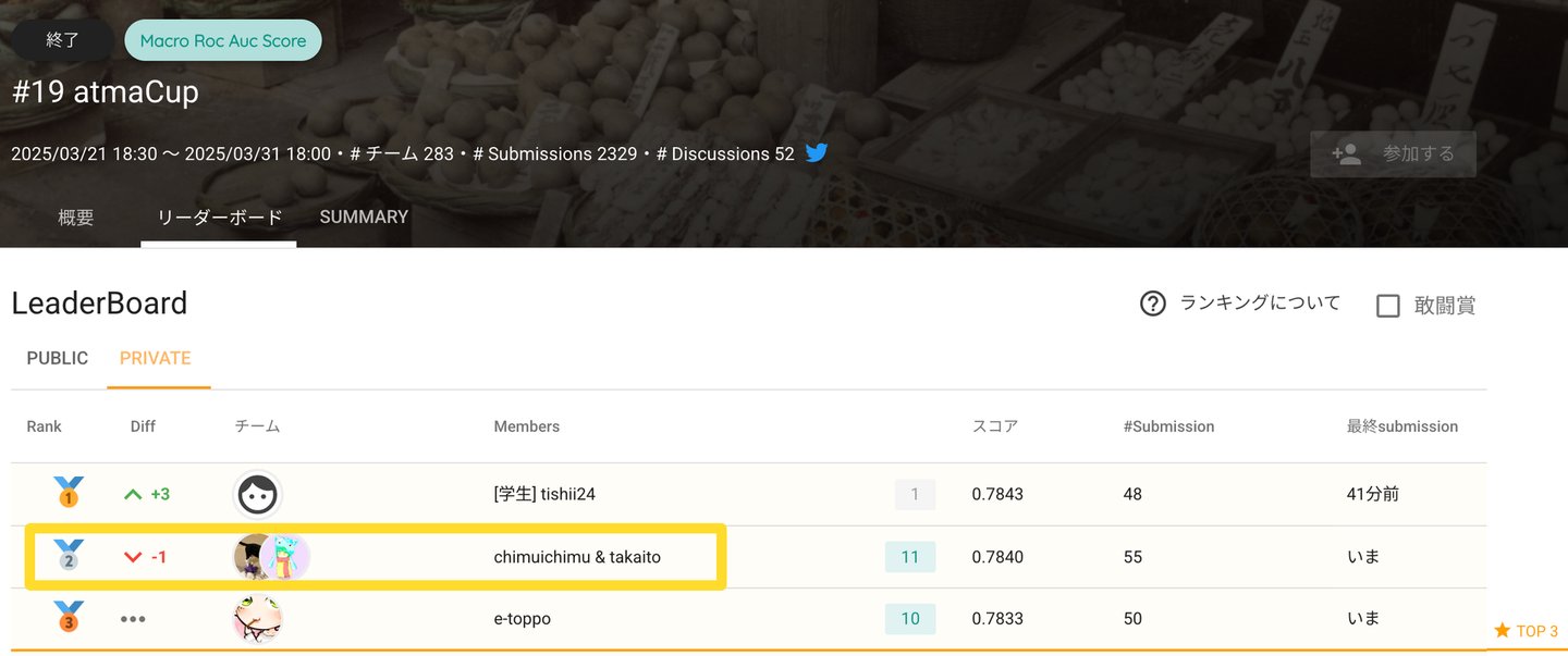 このような工夫の積み重ねにより、今回の atmaCup では総合2位という満足のいく結果を得ることができました。もちろんこの結果は、自身が比較的得意なテーマであったことや、チームメイトの多大な貢献といった要因も大きいです。ただ、朝の時間に生まれたアイデアや、集中して分析できたことがスコアにつながった場面が多くありました。