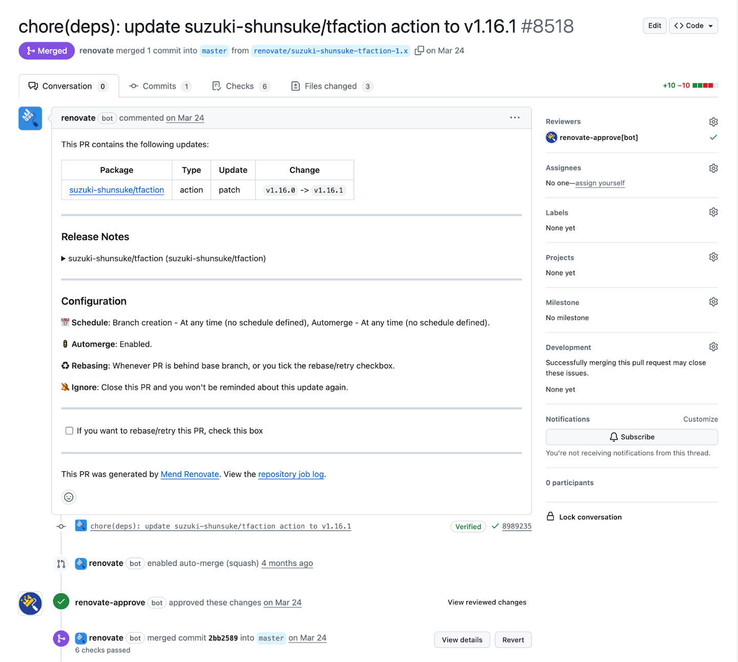 しかし、Terraformのようにインフラに直接影響を与えるコードでは、自動マージは慎重に行う必要があります。tfactionでは、terraform planの結果に差分が含まれていた場合はCIを失敗させる設計になっており、差分がない場合のみ自動でマージされるようになっています。これにより、安全性を担保しつつ、tfactionならびに依存ツールの継続的なアップデートを自動で行うことができます。