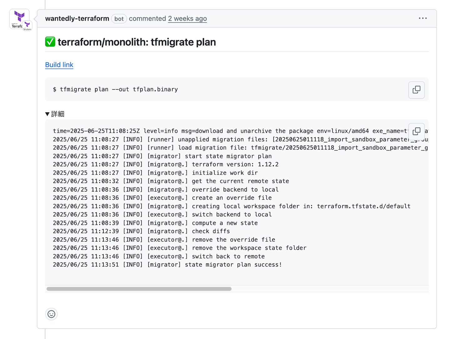 tfmigrate planを実行すると、実際にtfstateを変更する前に差分を確認できるため、安全性を確保しつつ事前に内容をレビューできます。問題がなければtfmigrate applyを使って、変更を本番のtfstateに反映します。このようにtfmigrateを使えば、意図しない変更を防ぎながら、変更内容をチームで確認・承認するフローを構築できます。tfactionではtfmigrateの実行も自動化されており、安全かつレビューしやすいtfstate操作を実現できます。
