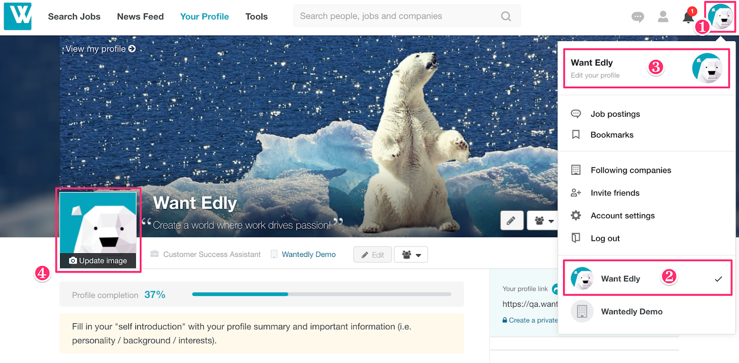 - Select your name on the drop-down menu to edit your Wantedly profile.